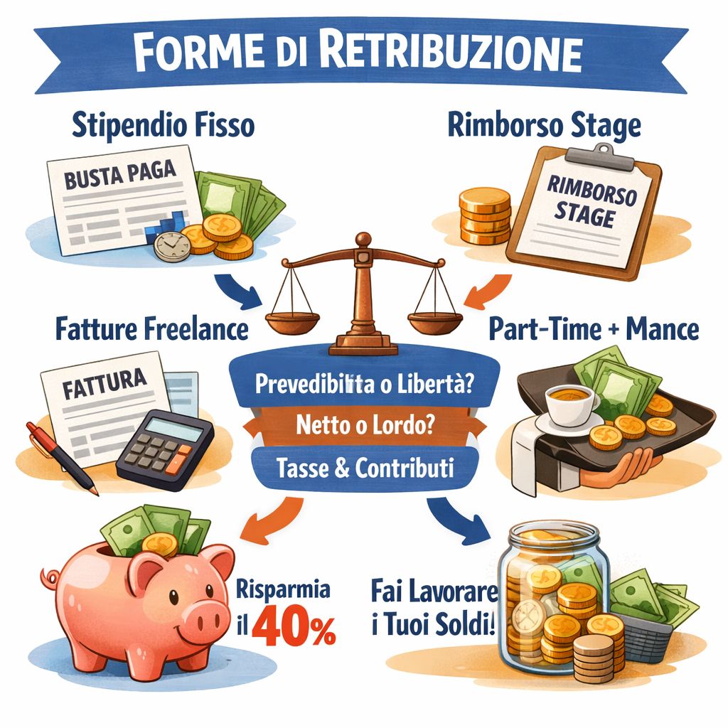 Stipendio fisso da dipendente? Rimborso stage? Fatture freelance? Part-time con mance? Ogni forma ha regole diverse: prevedibilità vs libertà, netto vs lordo, tasse e contributi da calcolare. Scopri pro e contro di ciascuna, impara a leggere la busta paga, metti via il 40% subito se freelance o apri un salvadanaio per extra. L’obiettivo è lo stesso: fai lavorare i tuoi soldi per te, non contro